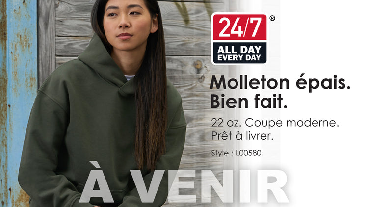 260 g/m2 “ 7.7 oz./yd2 “ 13 oz./vg lin. molleton 100% polyester brossé d'un coté, anti boulochage. Ruban contrastant deux-tons à chevrons à l'arriere du col. Pochette pour téléphone avec fer...